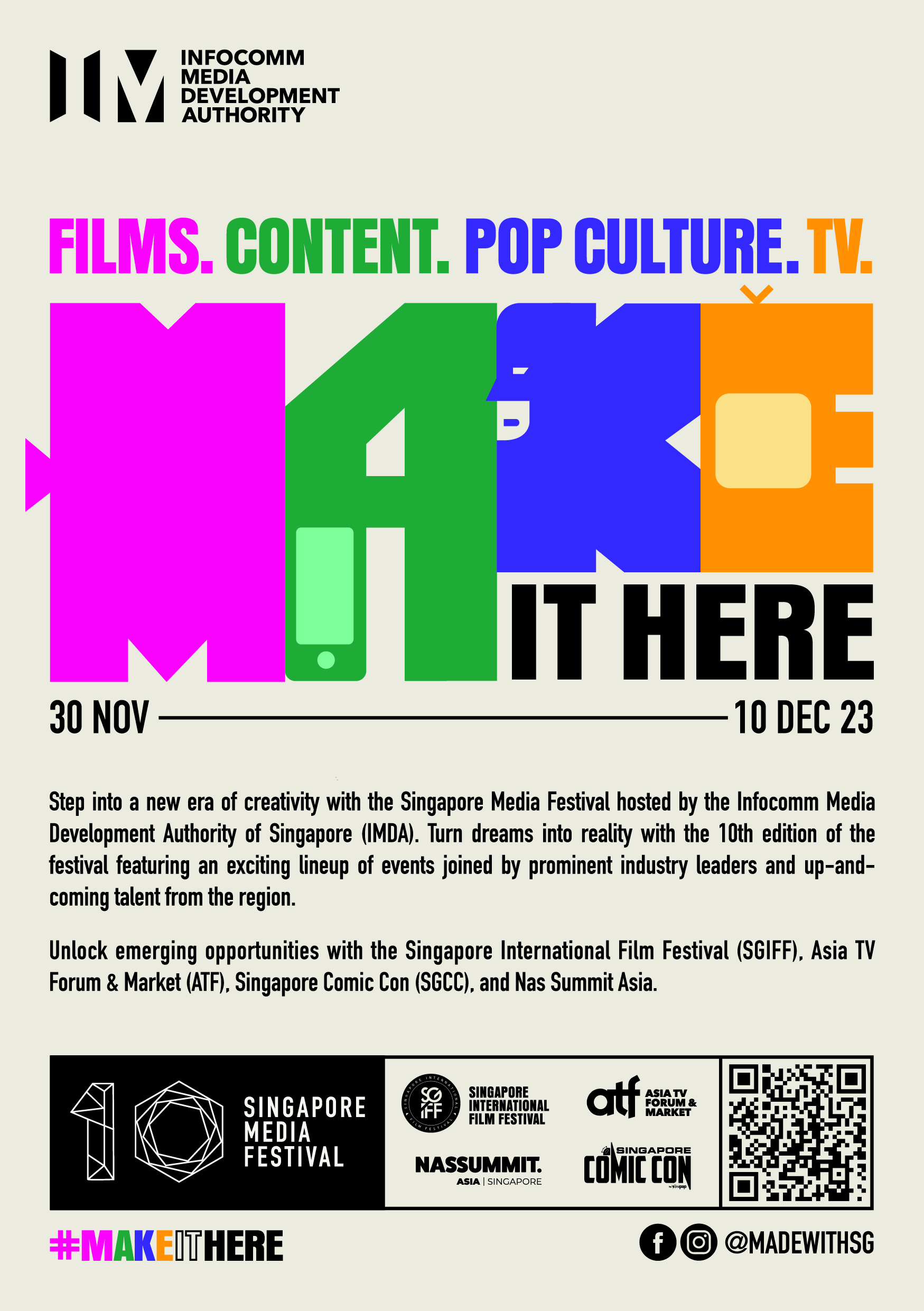 2023 also marks the 10th edition of the Singapore Media Festival, rallying Asia’s most passionate media professionals, industry leaders, talents and content creators to “Make It Here”! For more details on the Singapore Media Festival and its partner events, please see the Annex or visit https://www.imda.gov.sg/sgmediafest. Media materials are available in this digital kit here.