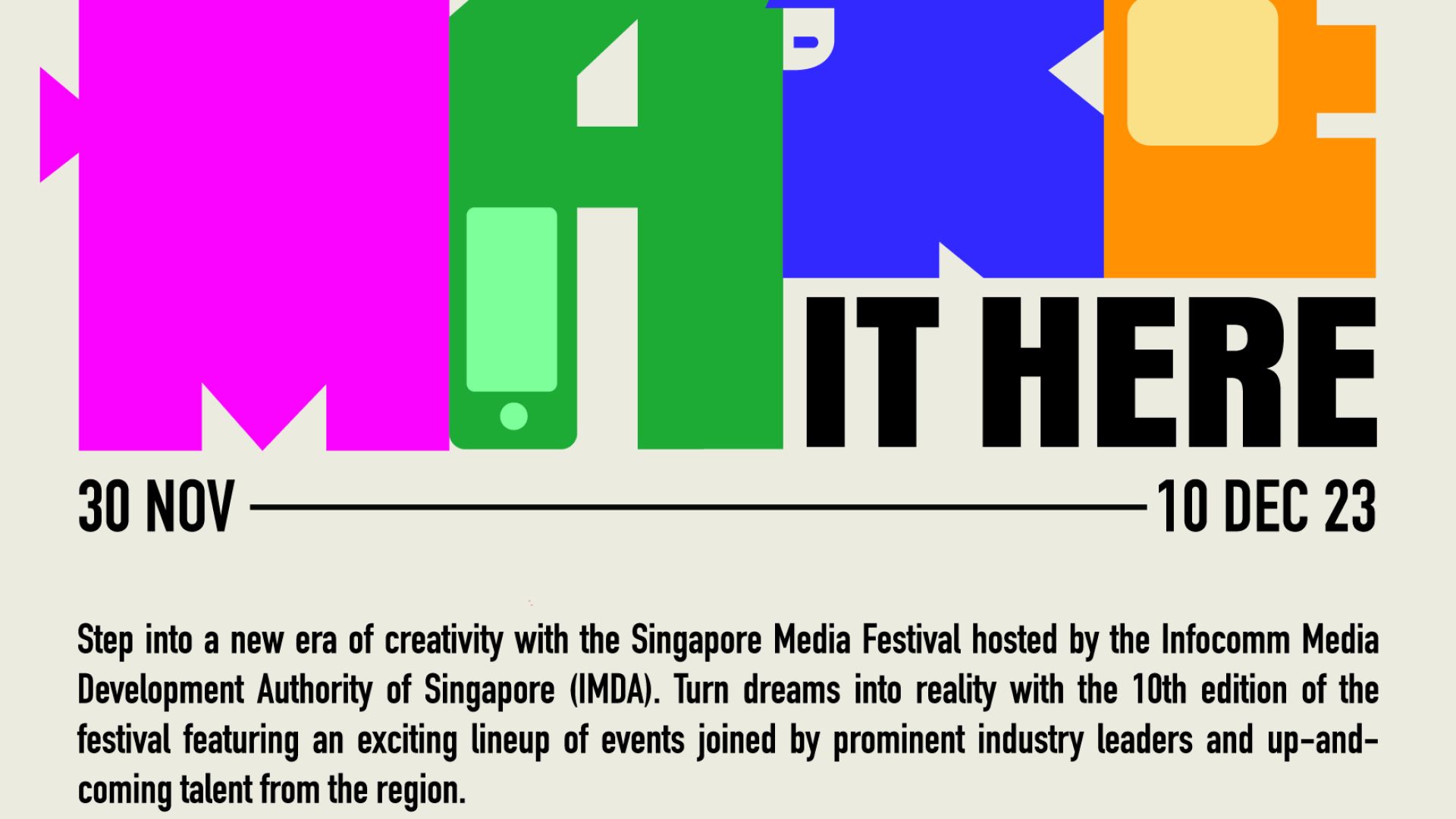 2023 also marks the 10th edition of the Singapore Media Festival, rallying Asia’s most passionate media professionals, industry leaders, talents and content creators to “Make It Here”! For more details on the Singapore Media Festival and its partner events, please see the Annex or visit https://www.imda.gov.sg/sgmediafest. Media materials are available in this digital kit here.