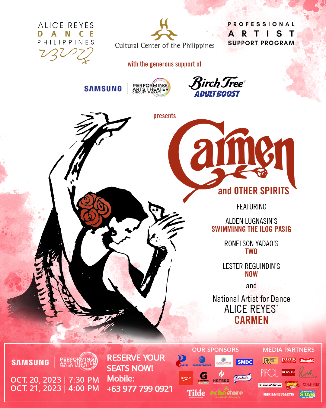 CARMEN AND OTHER SPIRITS is presented by Alice Reyes Dance Philippines, the Cultural Center of the Philippines, CCP’s Professional Artist Support Program (PASP), with the generous support of Samsung Performing Arts Theater and Birch Tree Adult Boost. It features dance trainees from Guang Ming College, Philippine High School for the Arts, De La Salle College of Saint Benilde, and other independent performers.