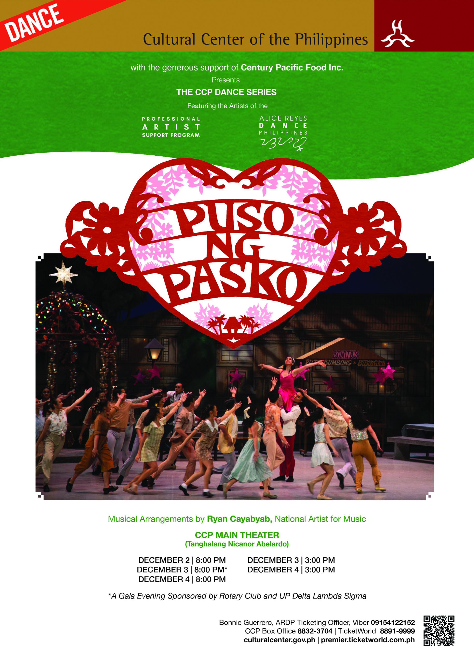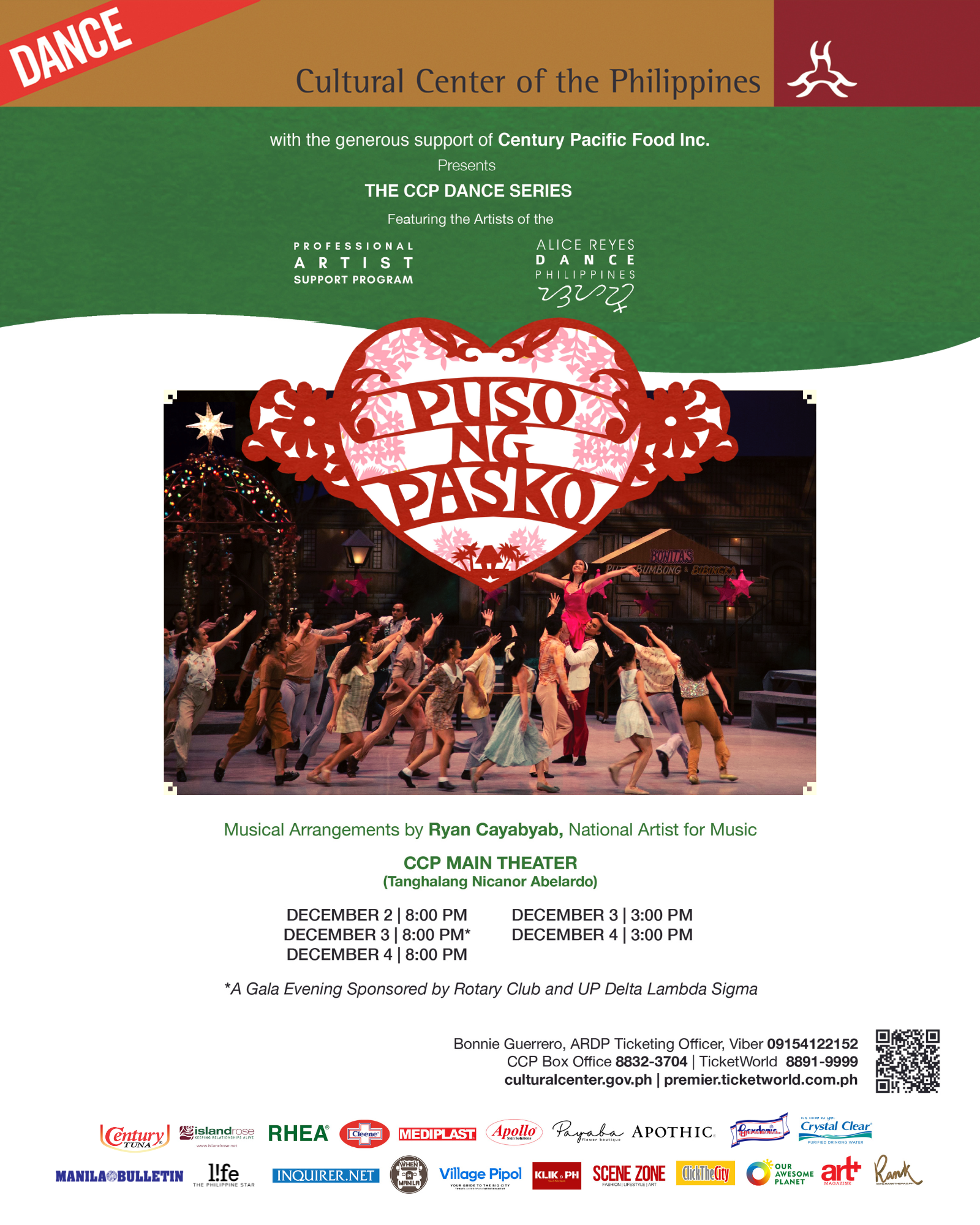 PUSO NG PASKO featuring artists of CCP’s Professional Artist Support Program and Alice Reyes Dance Philippines runs from December 2 to 4 at the CCP Main Theater. Tickets are available through the contacts below.