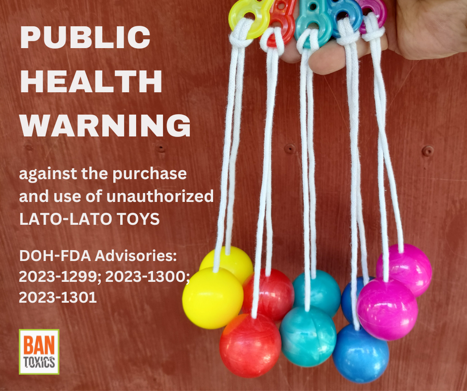 Toxic watchdog group BAN Toxics lauds the Food and Drug Administration (FDA) Philippines for issuing the FDA Advisories Nos. 2023-1299, 2023-1300 and 2023-1301 – a Public Health Warning against the purchase and use of unauthorized Toy and Childcare Article (TCCA) LATO-LATO TOYS.