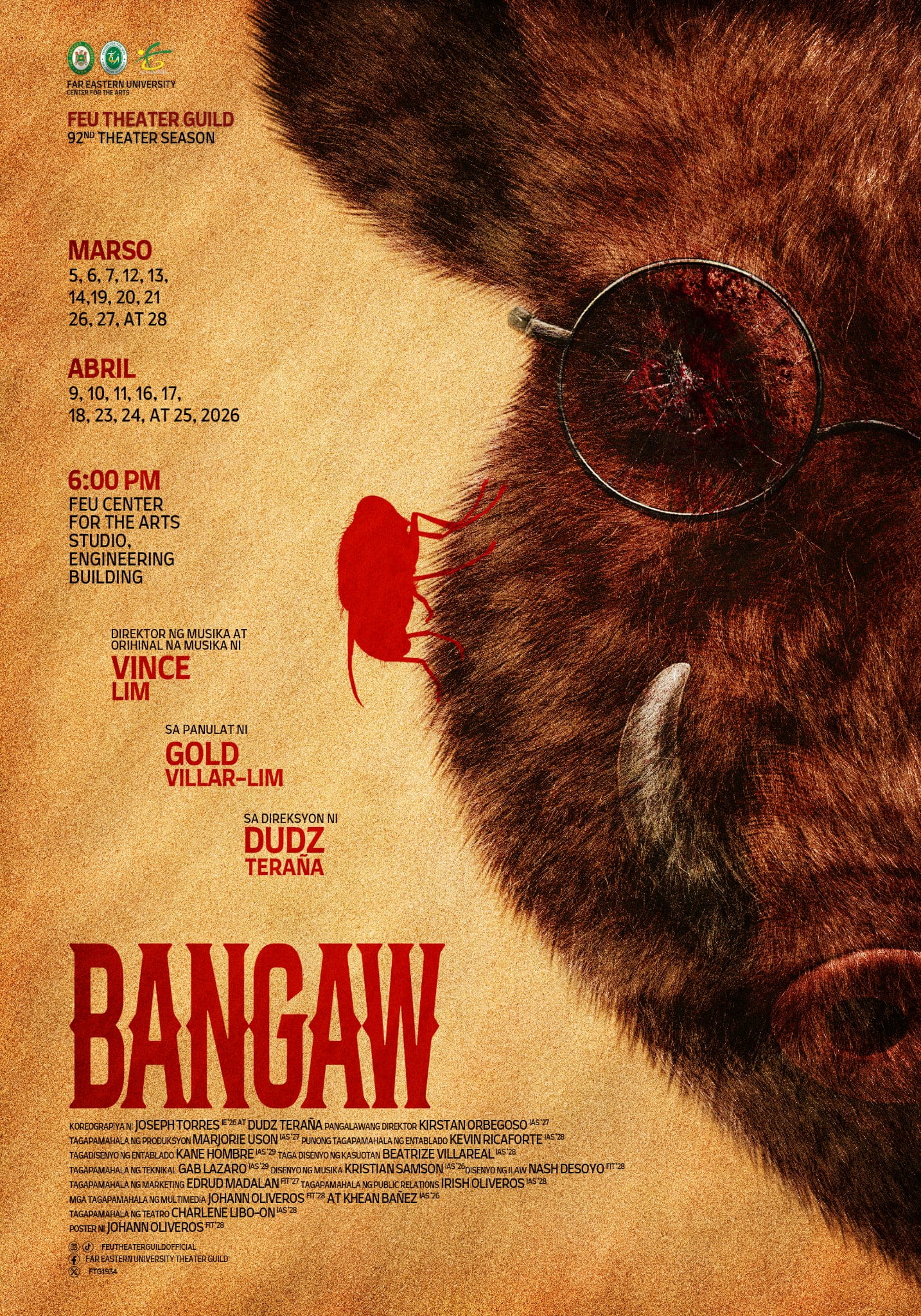 Layered with original music by Gold Villar-Lim, with two additional songs by Dudz Teraña, Bangaw blends symbolic movement and raw emotional expression with rhythmic, realistic storytelling. Traditional and modern Filipino soundscapes pulse throughout the production, serving as both atmosphere and metaphor for a nation caught between collapse and renewal.