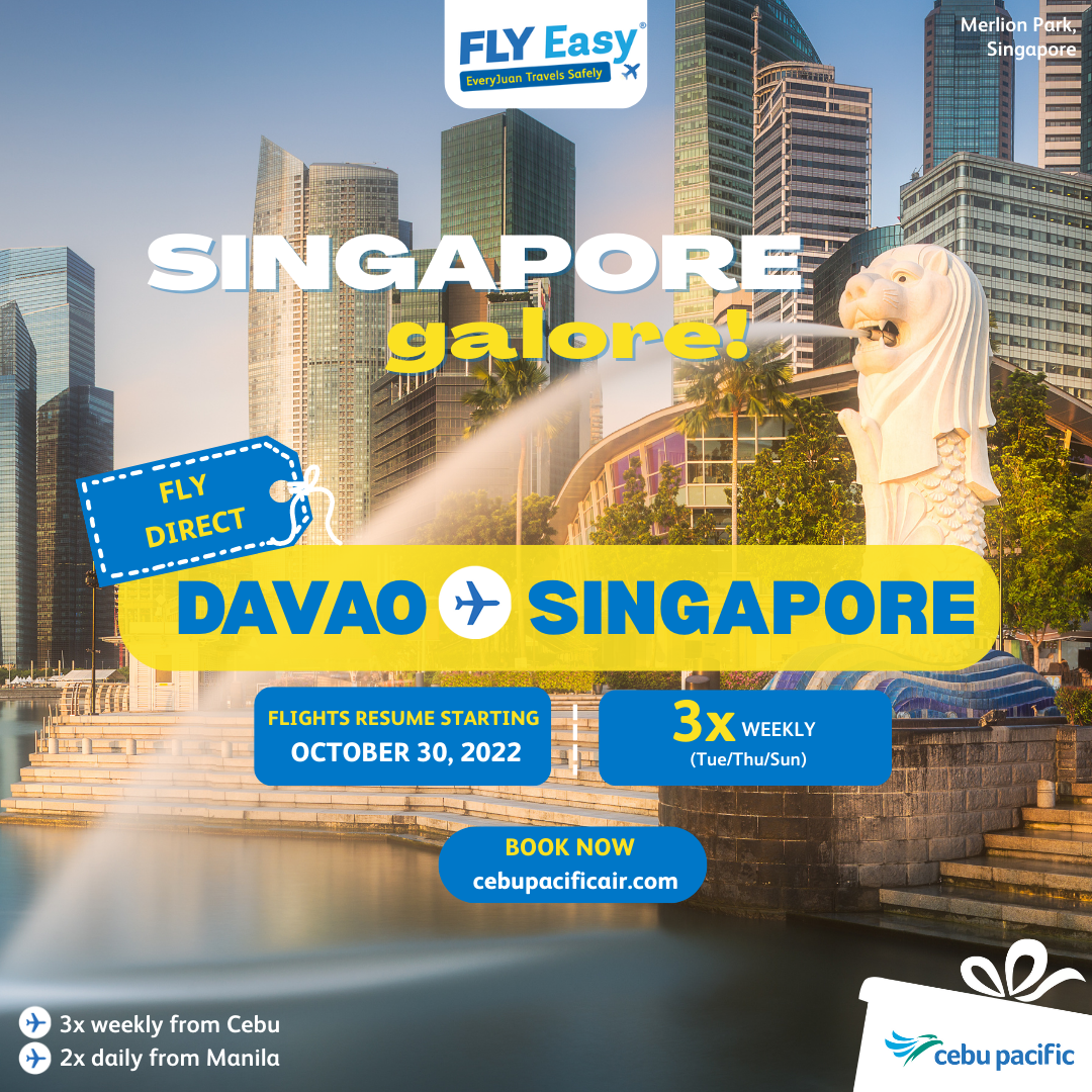 The Philippines’ leading airline, Cebu Pacific (PSE: CEB), continues to beef up its regional footprint as it announces the resumption of its international operations in its Davao hub, starting with direct flights to Singapore. CEB is the first local carrier to restart international flights from Davao since the pandemic.