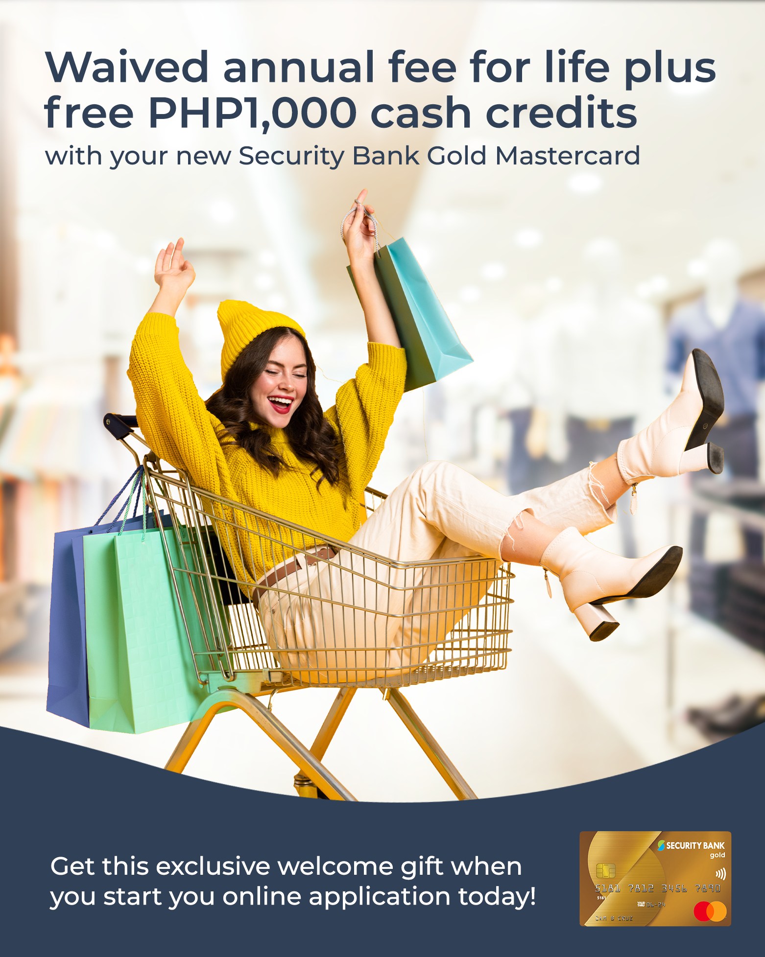 Get your perfect shopping credit card and take advantage of these exciting offers! Enjoy no annual fee for life plus an exclusive welcome gift of PHP1,000 cash credits with your new Security Bank Gold Mastercard.