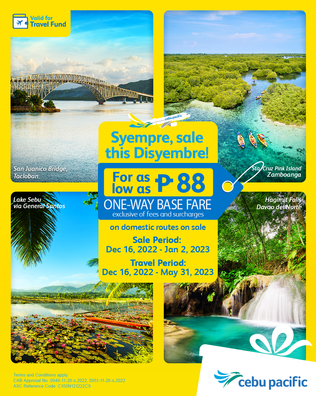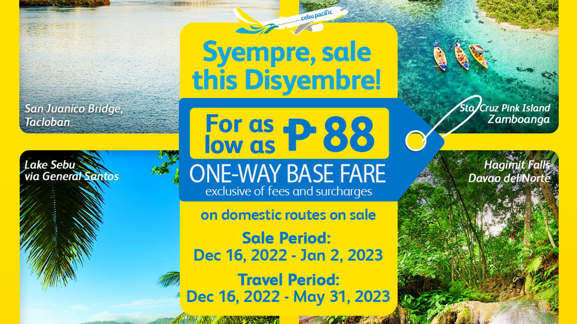 Until January 2, 2023, passengers may book flights to any domestic destination for as low as PHP 88 one-way base fare (exclusive of fees and surcharges).