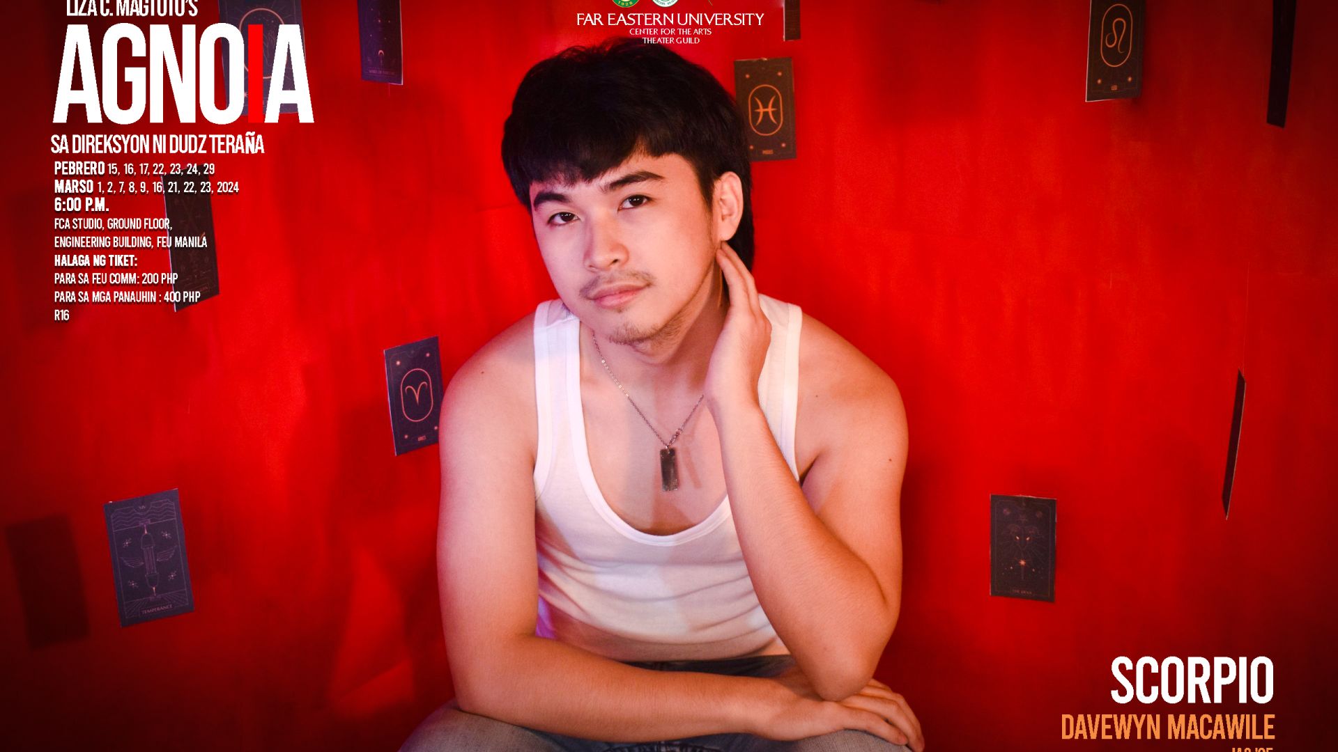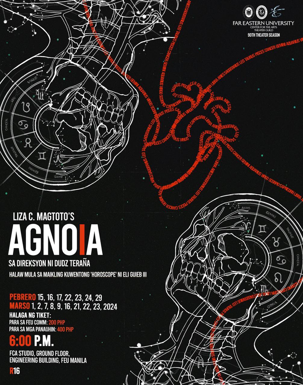 Catch Agnoia at 6:00 PM on February 15, 16, 17, 22, 23, 24, 29, March 1, 2, 7, 8, 9, 16, 21, 22, & 23, 2024 at the FEU Center for the Arts Studio, Ground Floor, Engineering Building.