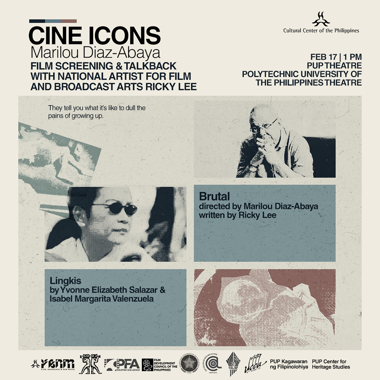 The Cine Icons soft launch screening will be held on February 17, starting at 1pm, at the PUP Theater, located inside the PUP Campus in Sta. Mesa, Manila, to be followed by a talkback by National Artist Ricky Lee. The event is made possible in partnership with the Polytechnic University of the Philippines and Film Development Council of the Philippines (FDCP).