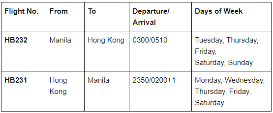 The flight schedule of GBA’s Manila – Hong Kong service is as follows: