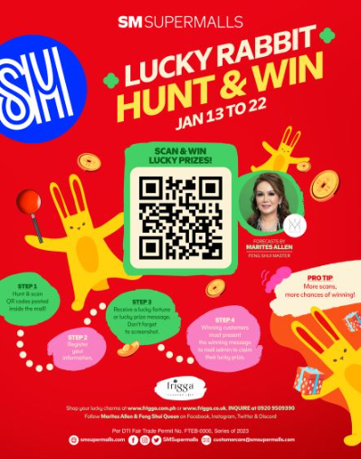 Test your luck at the Lucky Rabbit Hunt in SM malls! Join this AR hunt game by opening the app on your mobile device. Hunt for the triggers, scan the area, and catch lucky rabbits all around the mall with your family and friends. As the Year of the Water Rabbits predicts hope this 2023, SM Supermalls wishes their shoppers longevity, peace, and prosperity this Chinese New Year. So, hop on luck and enjoy all these CNY-themed activities safely and conveniently at your favorite SM Mall!