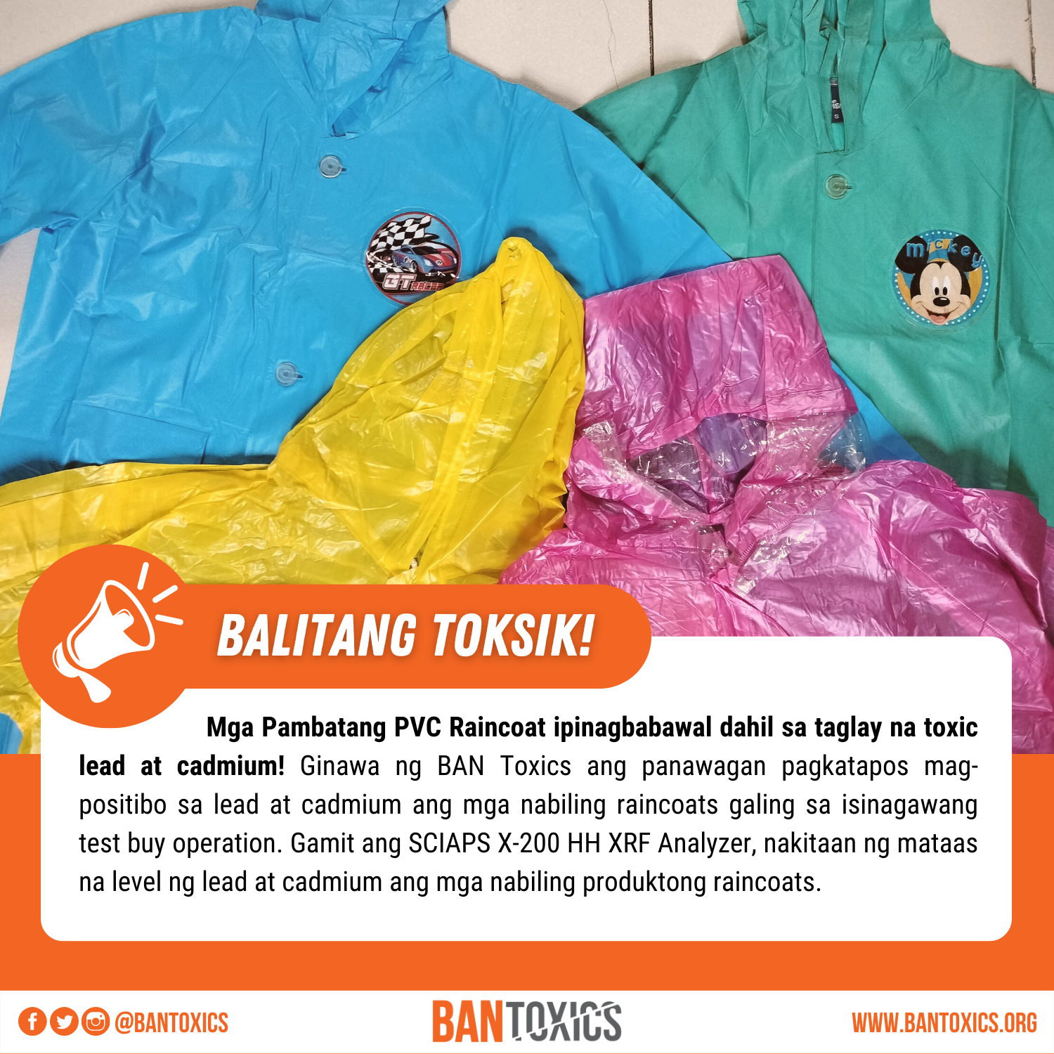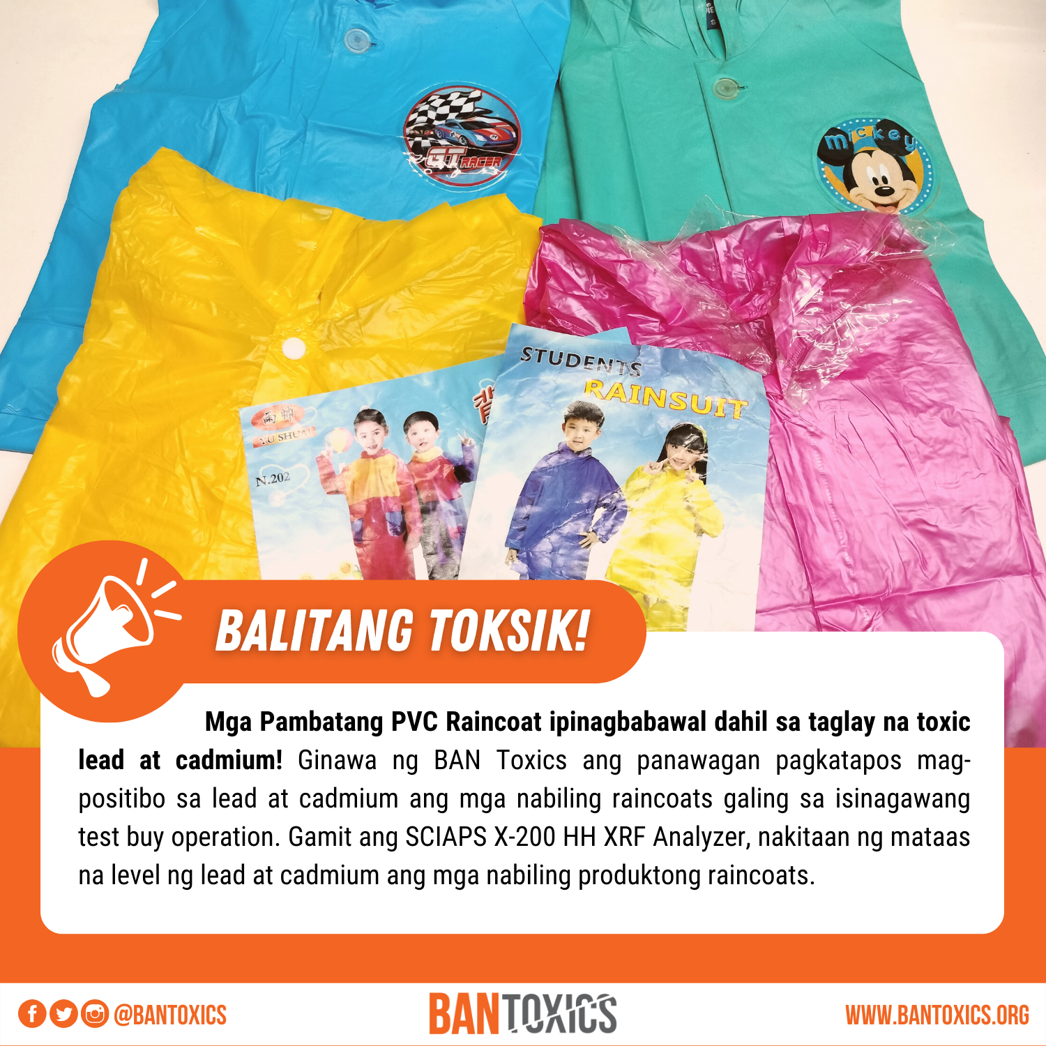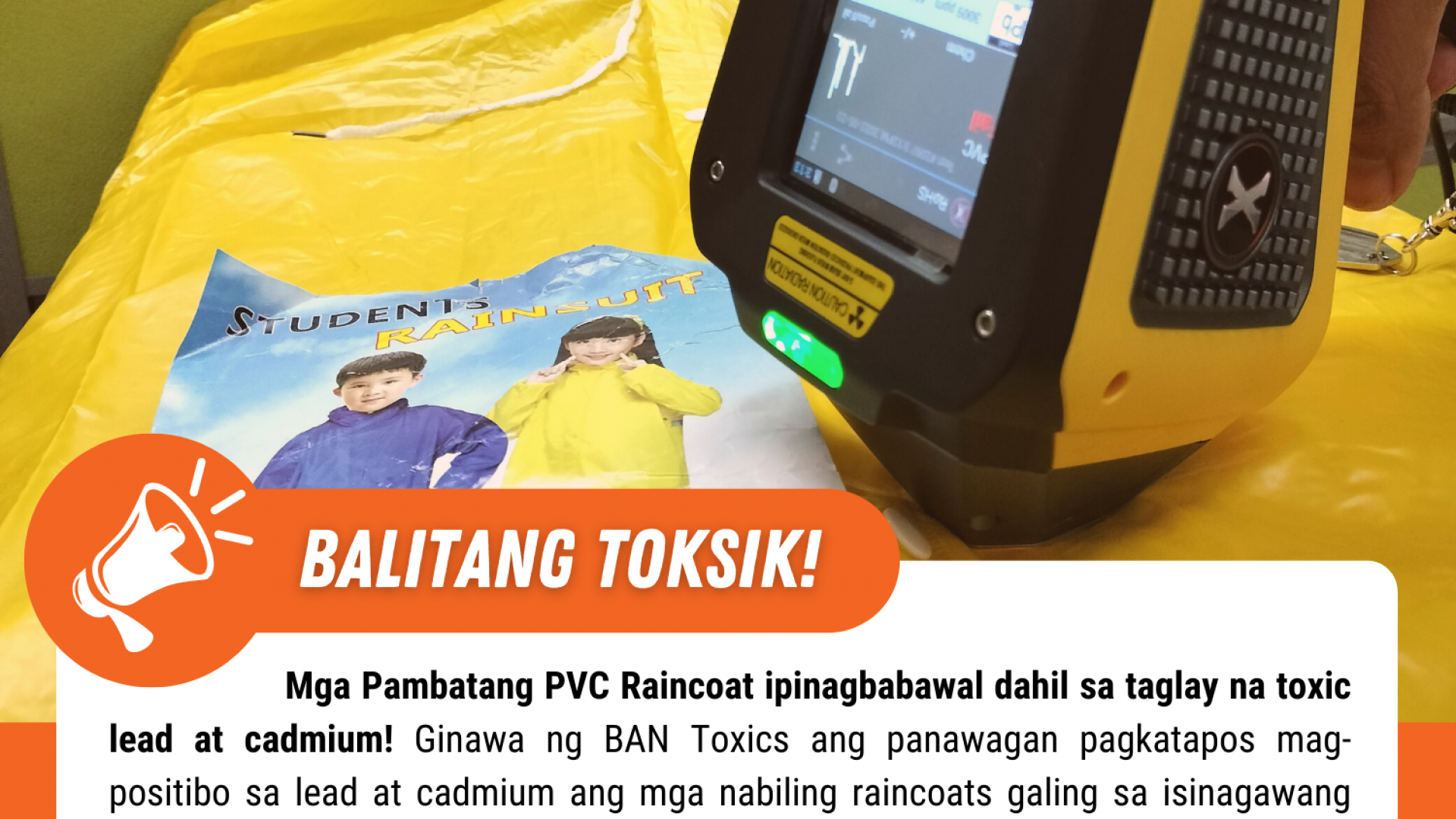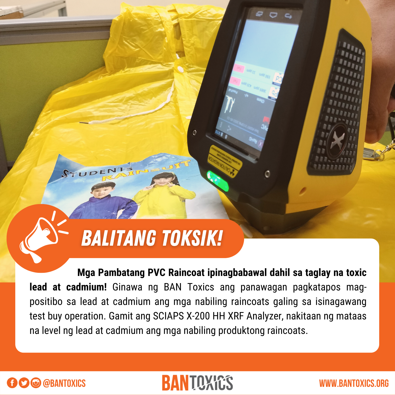 Ginawa ng BAN Toxics ang panawagan pagkatapos mag-positibo sa lead at cadmium ang mga nabiling raincoats galing sa isinagawang test buy operation. Gamit ang SCIAPS X-200 HH XRF Analyzer, nakitaan ng mataas na level ng lead at cadmium ang mga nabiling produktong raincoats.