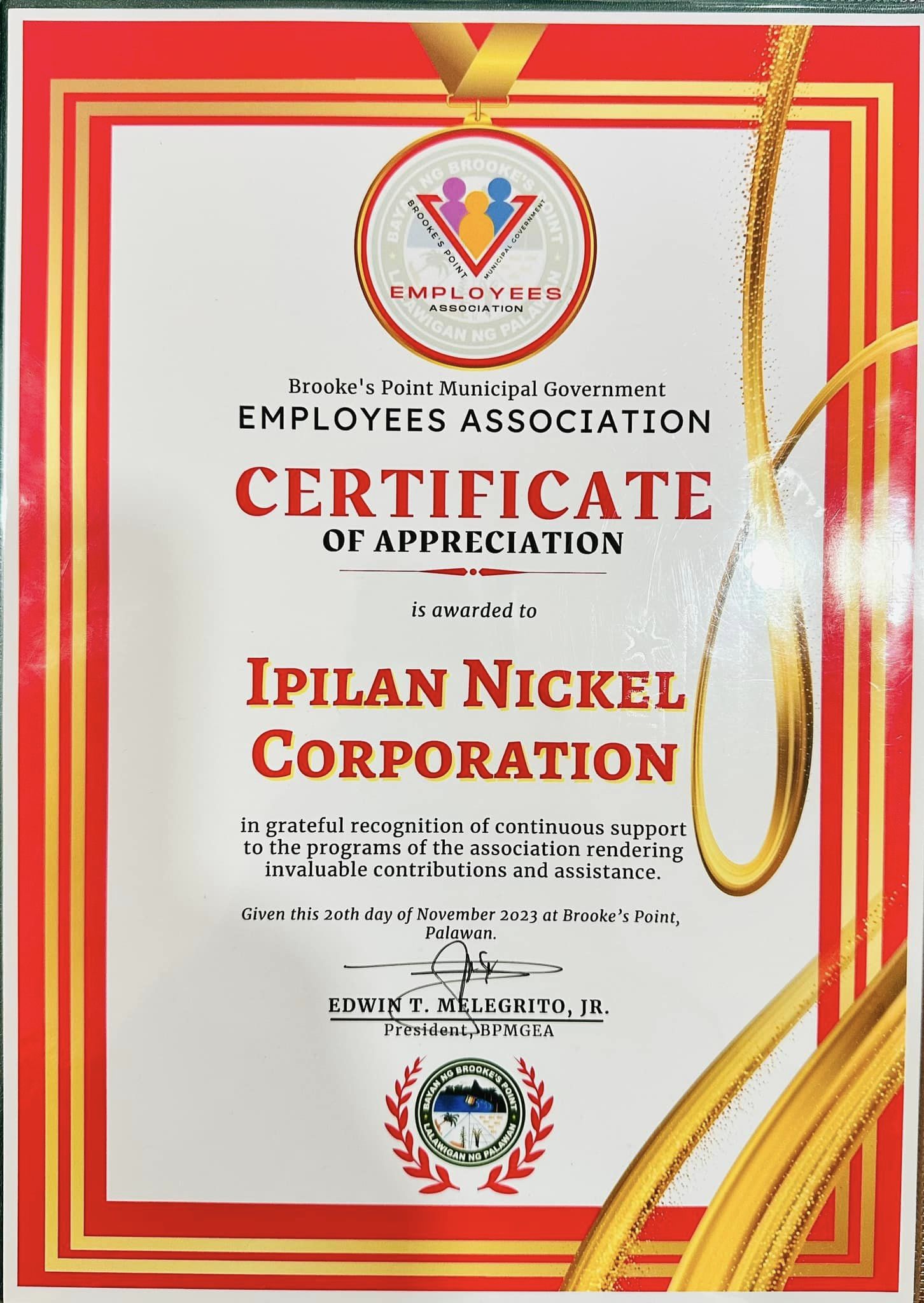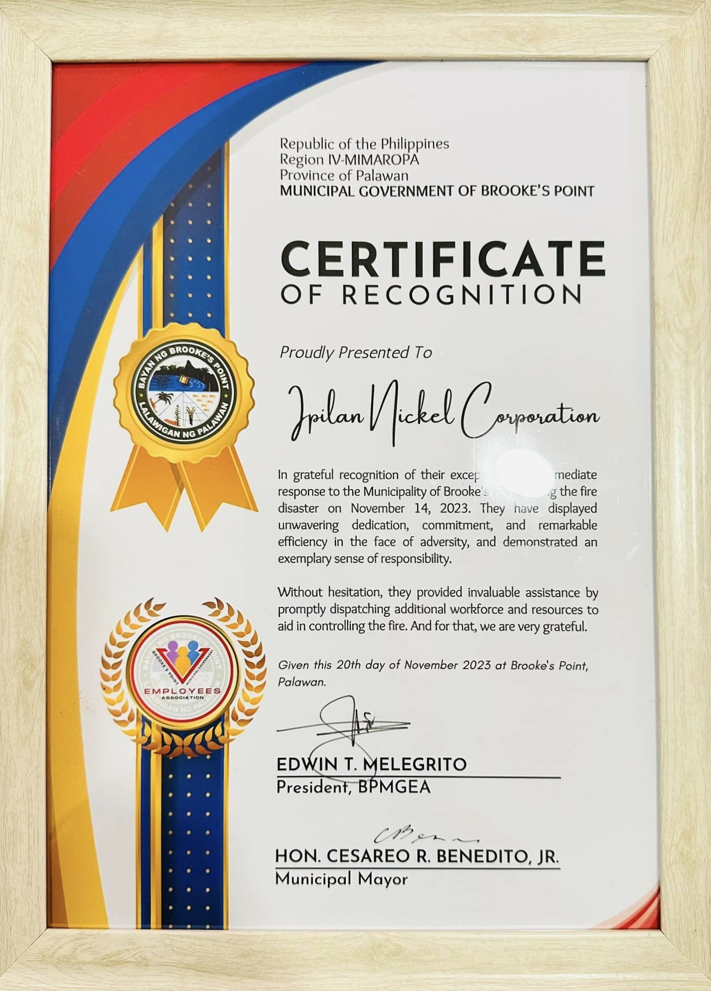 The Brooke’s Point Municipal Government, together with the Brooke’s Point Municipal Government Employees Association (BPMGEA), awarded Ipilan Nickel Corporation (INC) a Certificate of Recognition for its swift and effective response during the fire disaster that engulfed several houses and business establishments along Brooke’s Point Rotonda on November 14, 2023.