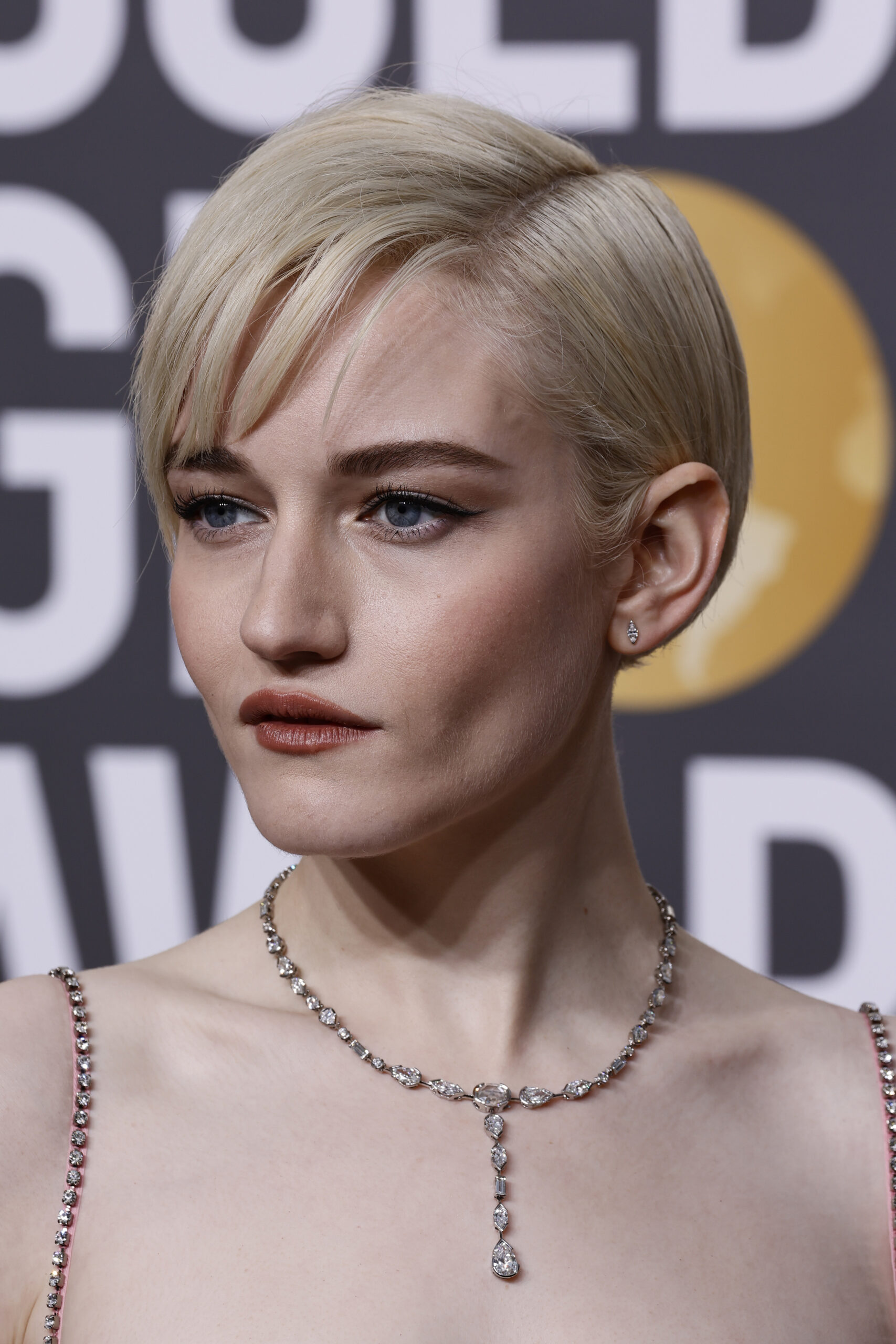 Julia Garner, double nominee and winner for Best Performance by an Actress in a Supporting Role in a Musical – Comedy or Drama TV Series, radiated natural elegance in classic diamond designs including a statement Swan Lake High Jewellery diamond necklace and mismatched delicate diamond earrings.