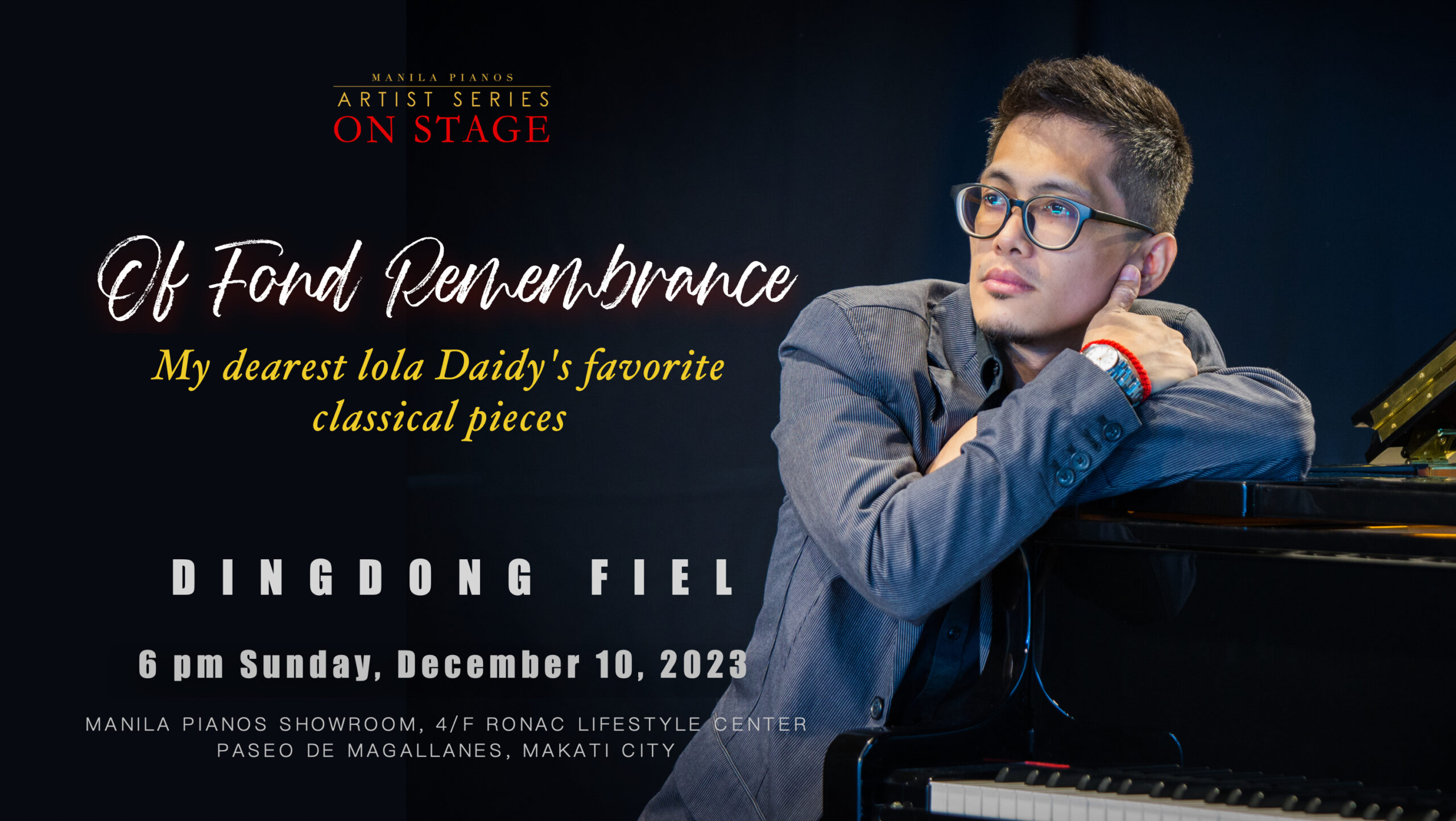 The recital will be on Sunday, December 10, 2023 at 6 pm. Venue is at Manila Pianos showroom, 4/F Ronac Lifestyle Center, Paseo de Magallanes, Makati City.