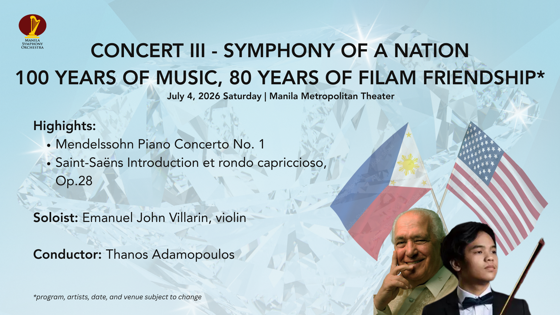Concert III – Symphony of a Nation: 100 Years of Music, 80 Years of FilAm Friendship July 4, 2026. Manila Metropolitan Theater