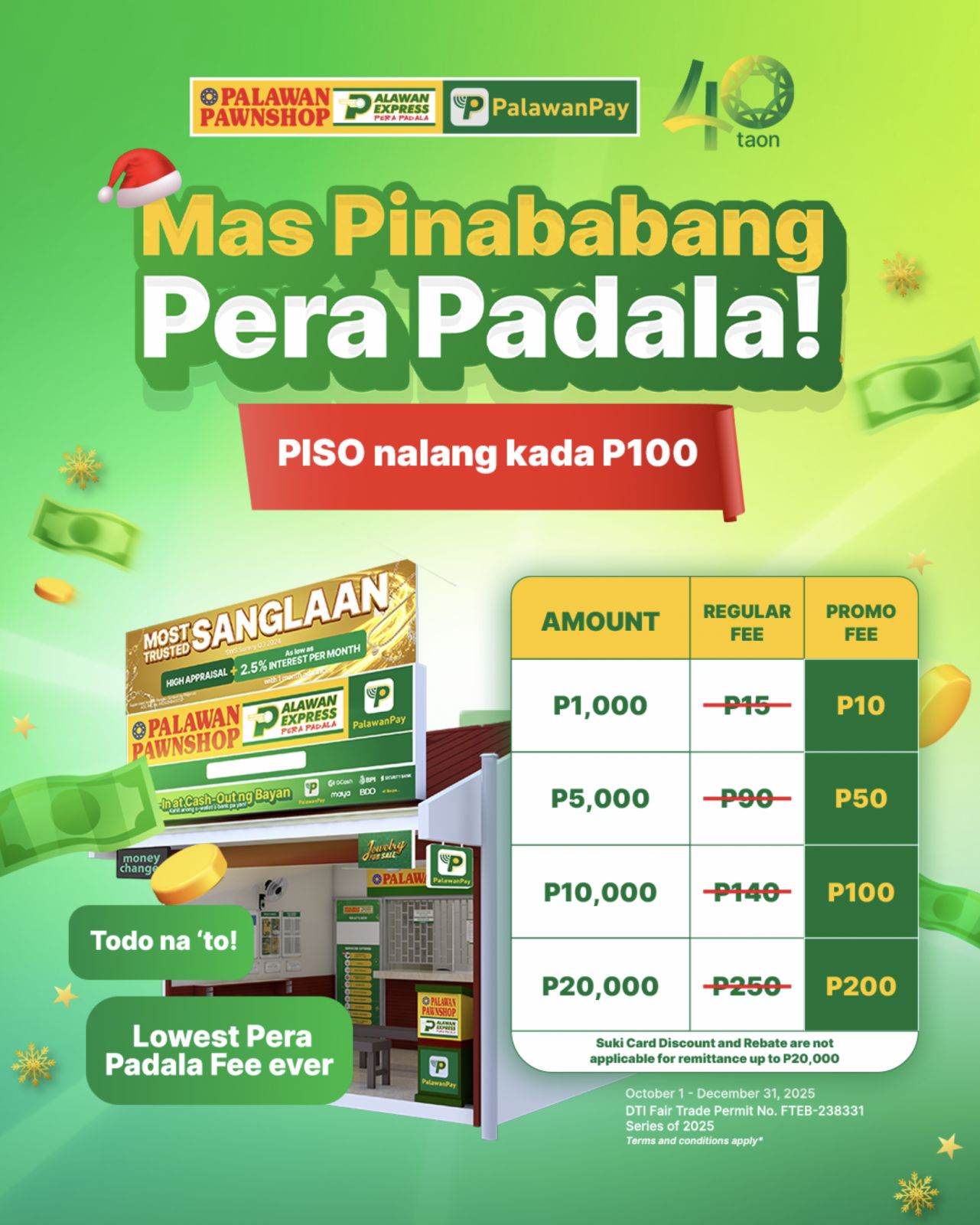 Palawan Group Chief Executive Officer Karlo M. Castro remarked, “Palawan Group is a proud 100% Pinoy company. We are run by Filipinos to serve fellow Filipinos, and deeply ingrained in our culture is a padala being more than just money — it’s a message of love, care, and connection. Through our Mas pinababang fees promo, we want to make it easier for families to send love this Christmas season, no matter the distance. Palawan Express Pera Padala has always been part of the Filipino family’s story, and this is our way of giving back — by helping them stay close even when they are physically far apart.”