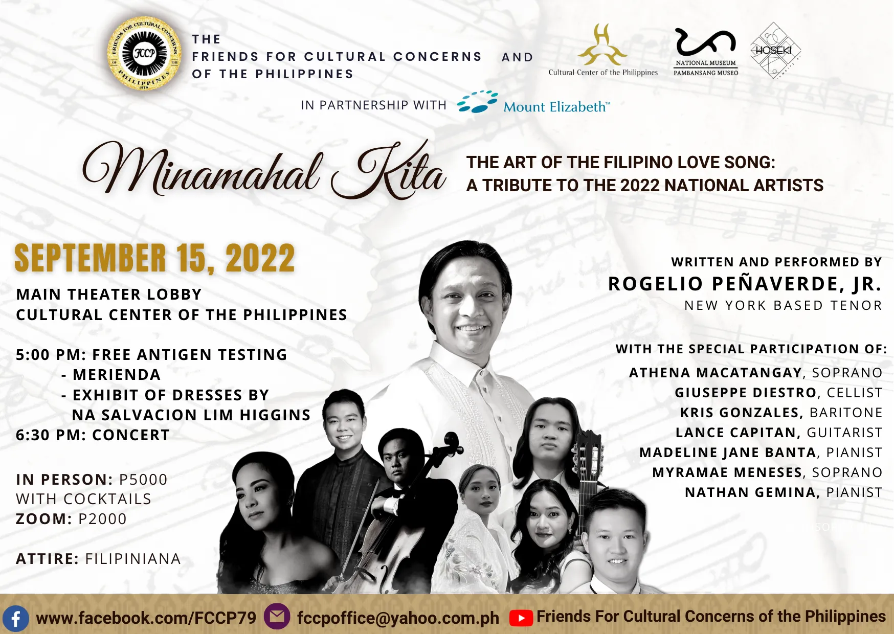 Entitled MINAMAHAL KITA: THE ART OF FILIPINO LOVE SONGS (A TRIBUTE TO THE 2022 NATIONAL ARTISTS), the show was conceptualized by Peñaverde and produced by the Friends for Cultural Concerns of the Philippines (FCCP) under the leadership of its current president, Martin Lopez.
