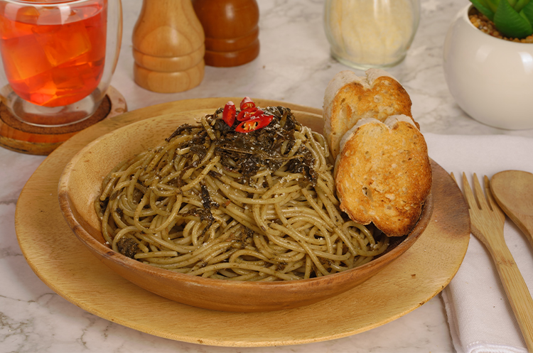 Add a spicy kick to your El Real Healthy Spaghetti by adding laing and chilis to it. The taro leaves used to make laing are known to be rich in vitamins A and C. For the sauce, it’s made with coconut cream to make it thicker and creamier.