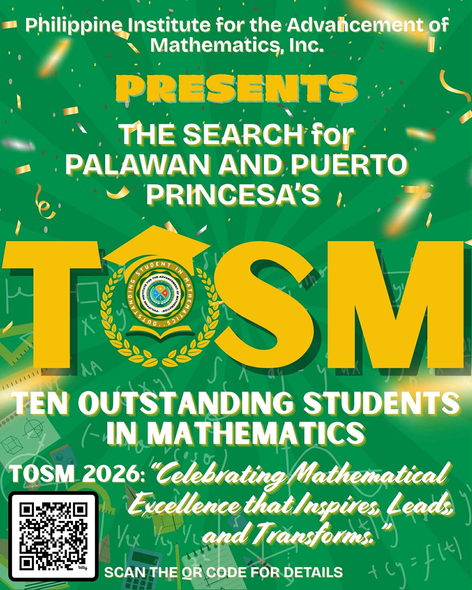 The Philippine Institute for the Advancement of Mathematics (PIAM), Inc. is proud to announce the successful conclusion of the Search for Palawan and Puerto Princesa’s Ten Outstanding Student in Mathematics (TOSM) 2026.