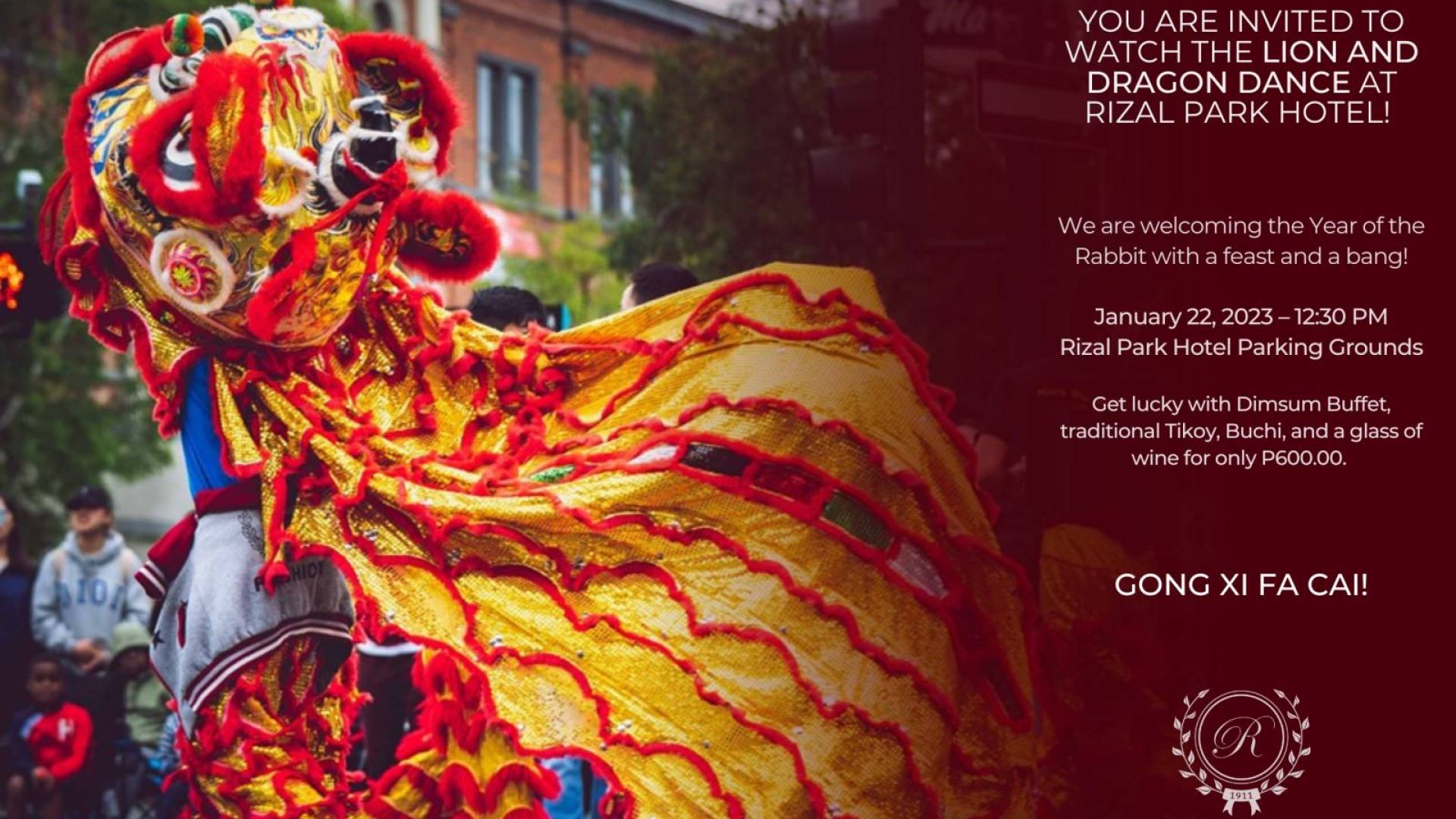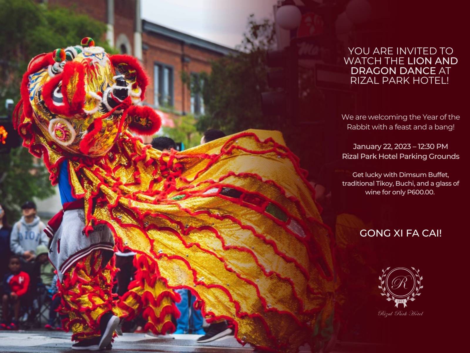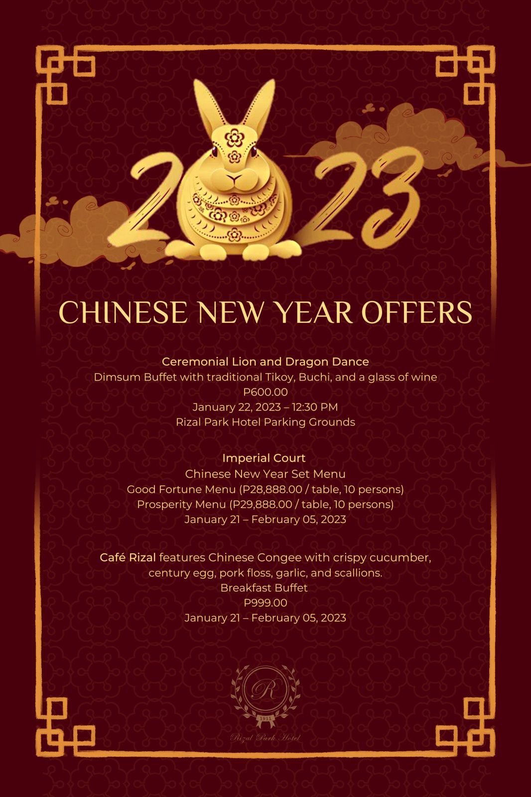 For more information about Rizal Park Hotel’s dining offers for the Lunar New Year, call (02) 8804-8700. Follow facebook https://www.facebook.com/RizalParkHotel and instagram https://www.instagram.com/rizalparkhotel1911/