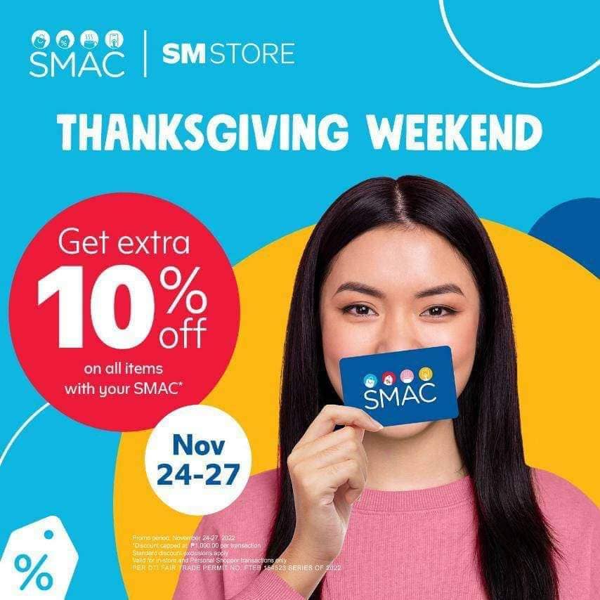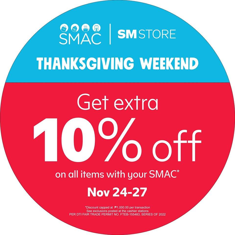 Just use your SMAC and get 10% off all items at SM Store, with no minimum purchase required. Discount is capped at P1,000 per transaction.