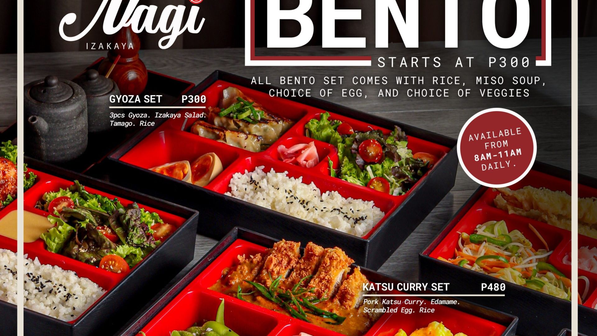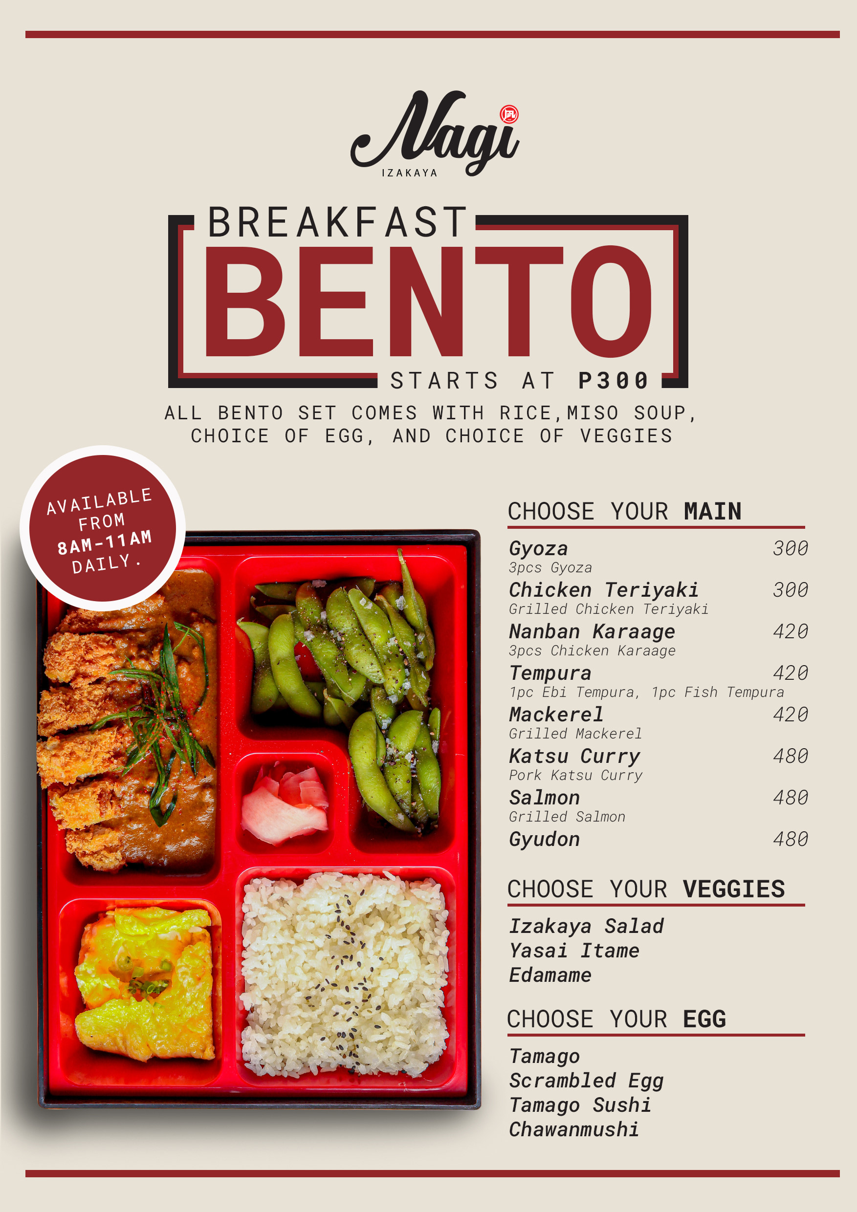 The breakfast bento is now available in all Nagi Izakaya and Wonderbowl branches nationwide. The breakfast bento is available for dine-in and takeaway from 8 AM to 11 AM.