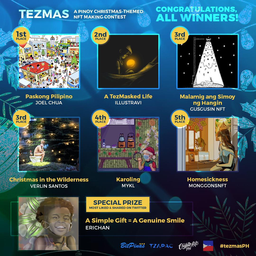 BitPinas, a local crypto news publication, and TZ APAC, the leading adoption entity for the Tezos ecosystem in Asia, successfully organized #tezmasPH, the first ever NFT-minting contest in the Philippines. Twenty five Filipino artists submitted their entries all depicting how Filipinos celebrate its longest holiday – the Christmas season. BitPinas and TZ APAC, together with visual artist Jopet Arias and community partners Crypto Art Philippines and NFT Philippines, are thrilled to announce the winners of this inaugural NFT competition: