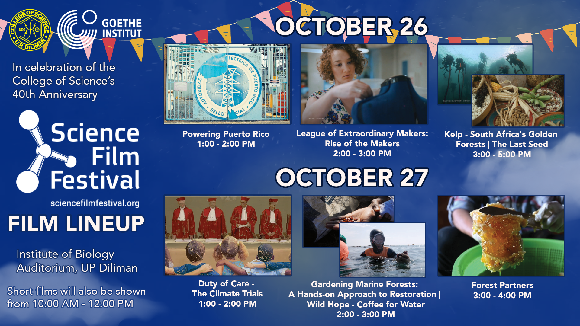 The two days of screenings (see schedule below) will kick off on the College’s Anniversary on Thursday, October 26, and will be held at the UPD-CS Institute of Biology Auditorium at the National Science Complex, UP Diliman. Students and members of the public are free to attend but may be asked to show a valid university or government ID for security purposes.