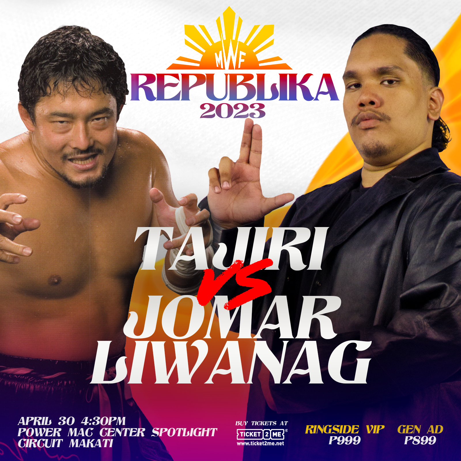 The Manila Wrestling Federation (MWF), the country’s rapidly growing athletic entertainment brand, once again delights Pinoy Wrestling fans with its annual spectacle MWF: Republika 2023 – boosted by the presence of WWE and ECW legend TAJIRI. The event will be held at Power Mac Center Spotlight PMCS Blackbox in Circuit Makati on April 30, Sunday, at 4:30 PM.